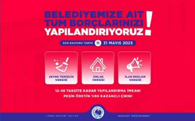 SON 3 GÜN! Belediyemize ait emlak, ilan-reklam ve çevre temizlik vergilerini 12-48 ay taksit veya peşin ödemelerde, borcun faizinde %90 indirim yaparak yapılandırıyoruz. 31 Mayıs Çarşamba son gündür. ...