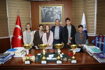 Kaşüstü Cumhuriyet Ortaokulu Müdürü Ziya Akgün Beden Eğitimi Öğretmeni Ali Buzkuş ve Okul Sporları Puanlı Atletizim İl Şampiyonası’nda yıldız kızlar il birinciliği, yıldız erkekler il birinciliği, küçük kızlar il birinciliği ve küçük erkekler il ikinciliği elde eden öğrencilerimiz, Belediye Başkanımız Mustafa Bıyık’ı makamında ziyaret etti. Başkanımız, öğrencilerimizi tebrik ederek başarılarının devamını diledi.