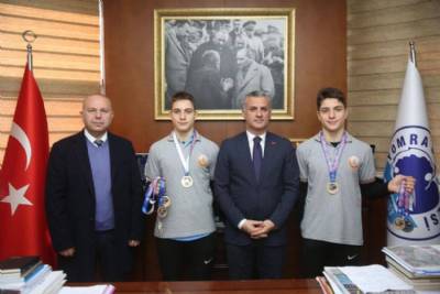 Yomra Kaşüstü Cumhuriyet Ortaokulu Müdürü Ziya Akgün ve Türkiye Arena Kısa Kulvar Küçükler Bireysel Yüzme Şampiyonası’nda birincilik elde eden öğrencilerimiz Kırkhan Yılmaz ve Kadirh...