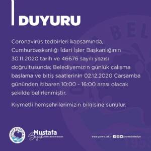 DUYURU Coronavirüs tedbirleri kapsamında, Cumhurbaşkanlığı İdari İşler Başkanlığının 30.11.2020 tarih ve 46676 sayılı yazısı doğrultusunda; Belediyemizin günlük çalışma başlama ve bitiş saatlerinin 02.12.2020 Çarşamba g&...