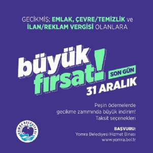 Gecikmiş; emlak, çevre/temizlik ve ilan/reklam vergisi borcu olanlara müjde: *Peşin ödemelerde gecikme faizinin yüzde 80’i silinecek. *Taksitle ödemek isteyenlere 6, 9 veya 18 taksit uygulanabilecek. Son gün 3...