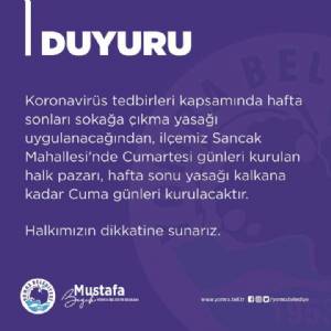 DUYURU Koronavirüs tedbirleri kapsamında hafta sonları sokağa çıkma yasağı uygulanacağından, ilçemiz Sancak Mahallesi'nde Cumartesi günleri kurulan halk pazarı, hafta sonu yasağı kalkana kadar Cuma günleri kurulacakt...